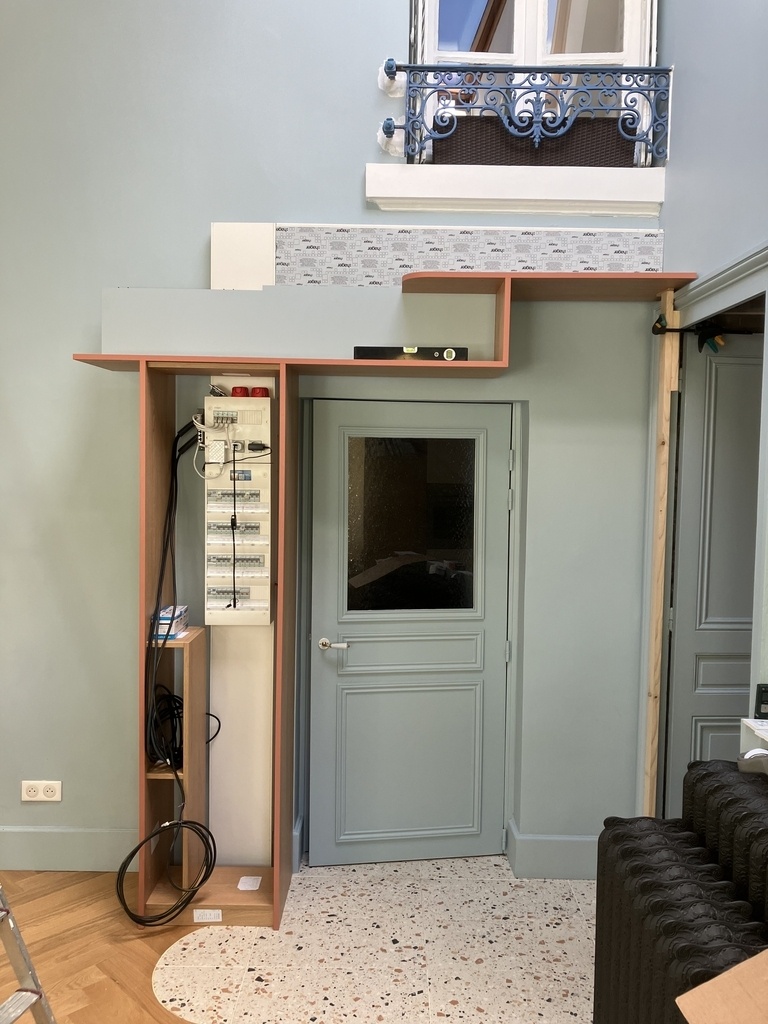 Voilà un projet qui m'a poussé un peu plus à creuser de nouvelles choses. Ce projet est multi-fonction. A la fois il est là pour masquer un tableau électrique et sa gaine, puis pour habiller un grand mur et porter un vidéo projecteur et les haut-parleurs arrières.
