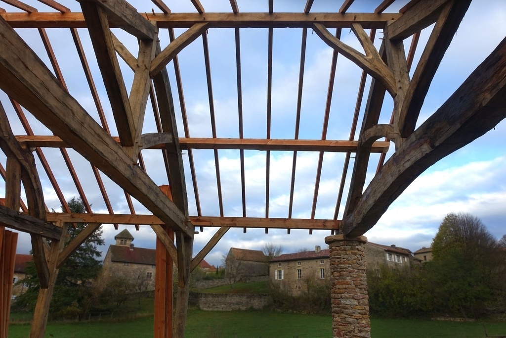 Charpente traditionnelle d'une grange dans le village de Blanot en Bourgogne, en bois équarri à la hache. Le chantier a été mené par deux artisans charpentiers (un brin de charpente et turlututu charpente pointue) et un stagiaire.