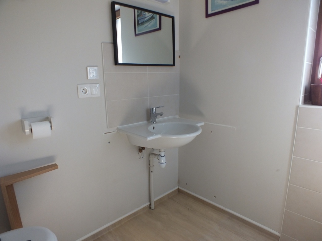 Petit meuble sous lavabo en remplacement d'un vieux meuble en méla. D'où les traces de silicone sur le mur.