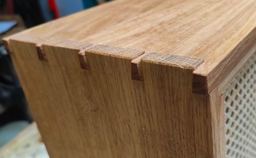 J'ai pris plaisir à réaliser ce petit meuble avec des chutes de chêne et d'érable. Cela faisait un petit bout de temps que je voulais faire des assemblages (queues d'arondes et carrées traversantes) aux outils manuels. A force d'être en admiration devant les réalisations de Mickaël Pekovich et de celles de certains membres du forum, il fallait que je m'y colle! Quel bonheur!