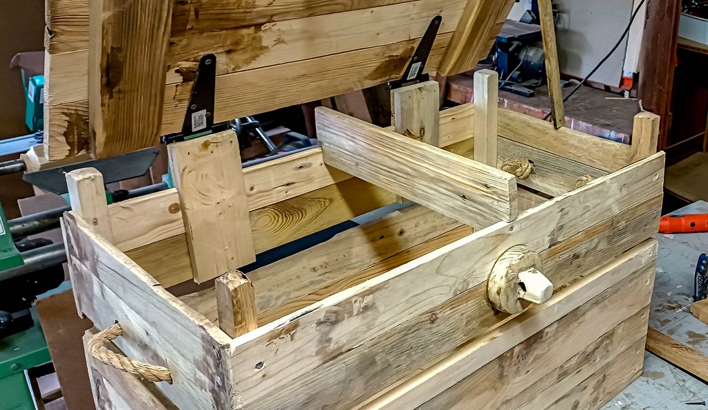 Une traverse a été rajoutée au cas où quelqu'un ait l'idée saugrenue de s'asseoir sur le coffre. Le traitement de surface sera effectué par la mère et son fils. Beaucoup de ponçage pour la chasse aux échardes.