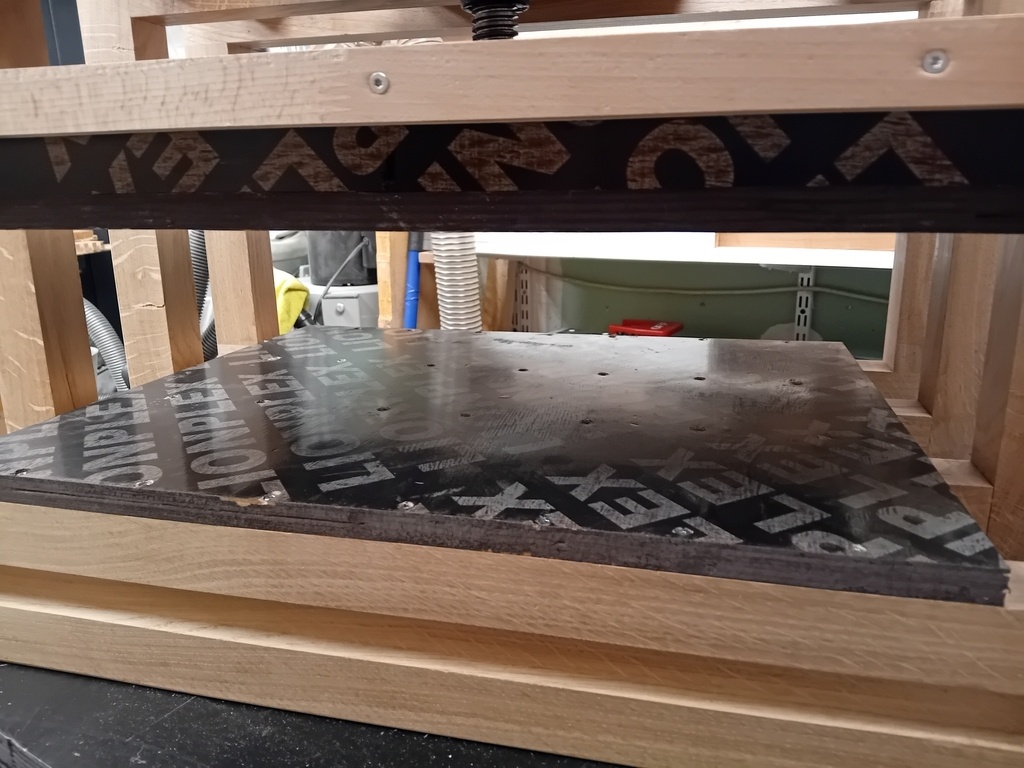 J'en profite pour vous présenter ma presse à plaquage que j'avais fabriqué il y a quelque temps en contreplaqué et que j'ai amélioré en chêne massif.