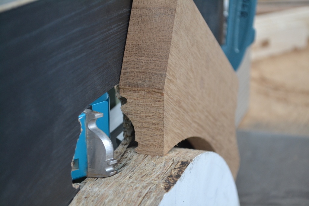 nous avions monté l'arbre au maximum ,c'etait un peu juste vu le rayon sinon il existe des rallonges d'arbre de toupie .On pourrai aussi le faire à la toupie horizontale ou moulurette ou a la toupie portative " mobilette".Encore faut il avoir ce genre d' outillage.Il est aussi possible de le faire au tarabisco,mais c'est une autre aventure vue la moulure...Au plaisir