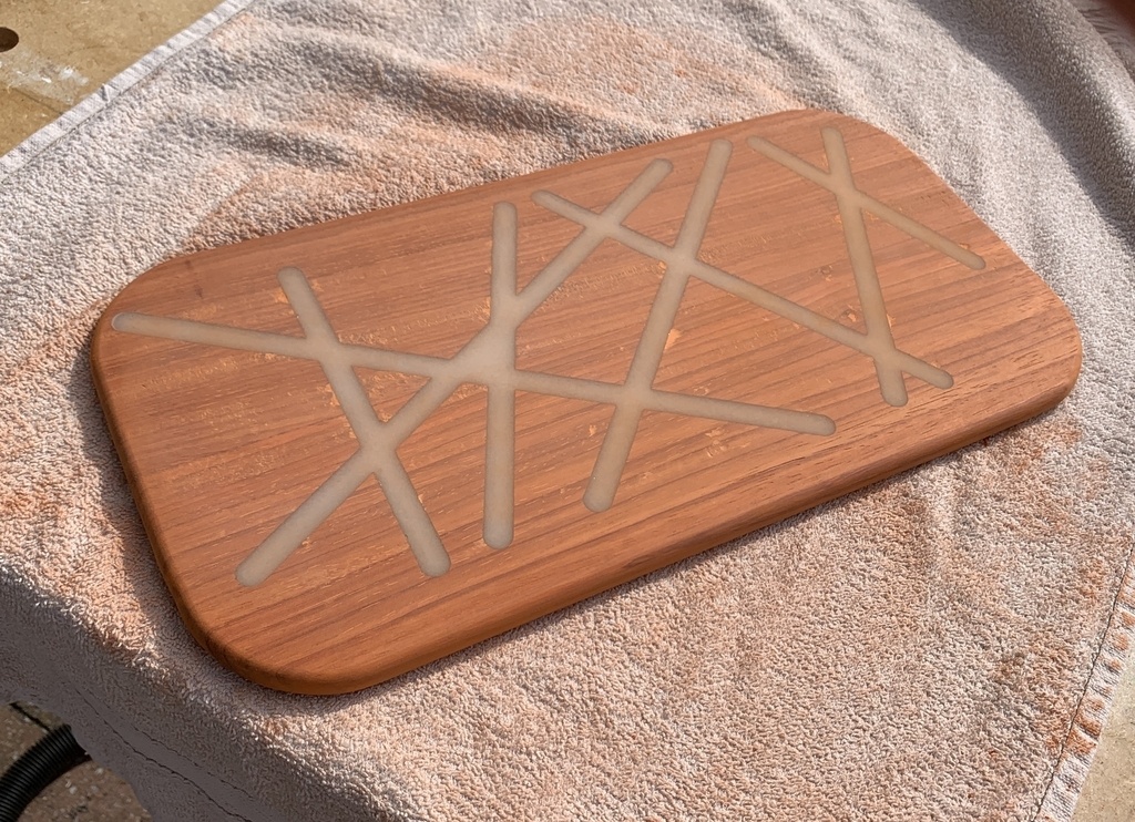 Dans ce premier essai de création utilisant du bois et de la résine époxy, je réalise une planche de présentation en padouk sur laquelle j’ai rainuré à la défonceuse des lignes aléatoires remplies de résine époxy colorée. La planche est ensuite recouverte de 2 couches de résine transparente dans le but de la protéger et de faciliter les nettoyages. Pour la finition, la planche est ponçée jusqu'au grain 3000.