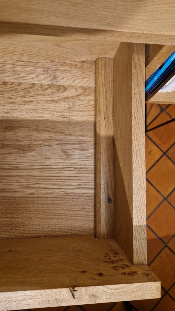 A l'époque je n'avais pas les machines pour travailler le bois massif. J'avais donc acheté des panneaux de chêne déjà rabotés. Il s'agit d'un assemblage assez simple à plat joint avec des chevilles.