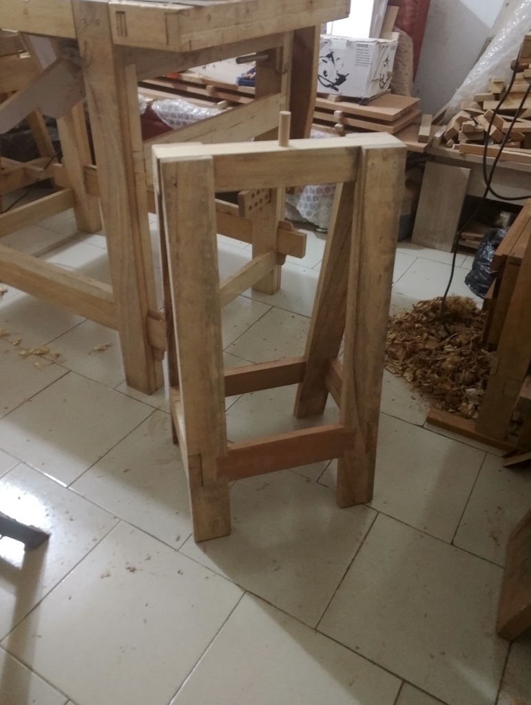 Les traverses en fromager, trapézoïdales, sont en principe plus faciles a faire, les entailles vont vite, il faut juste bien caler l'angle (il y a des petits ratés mais ça l'a fait finalement). L'astuce est de positionner le tréteau sur l'établi, dans sa position finale, maintenu par des serre-joints, de poser la pièce un peu plus longue contre le tréteau dans sa position finale et de tracer dessus l'angle de coupe. C'est simple et rapide, et on ne peut pas se rater.