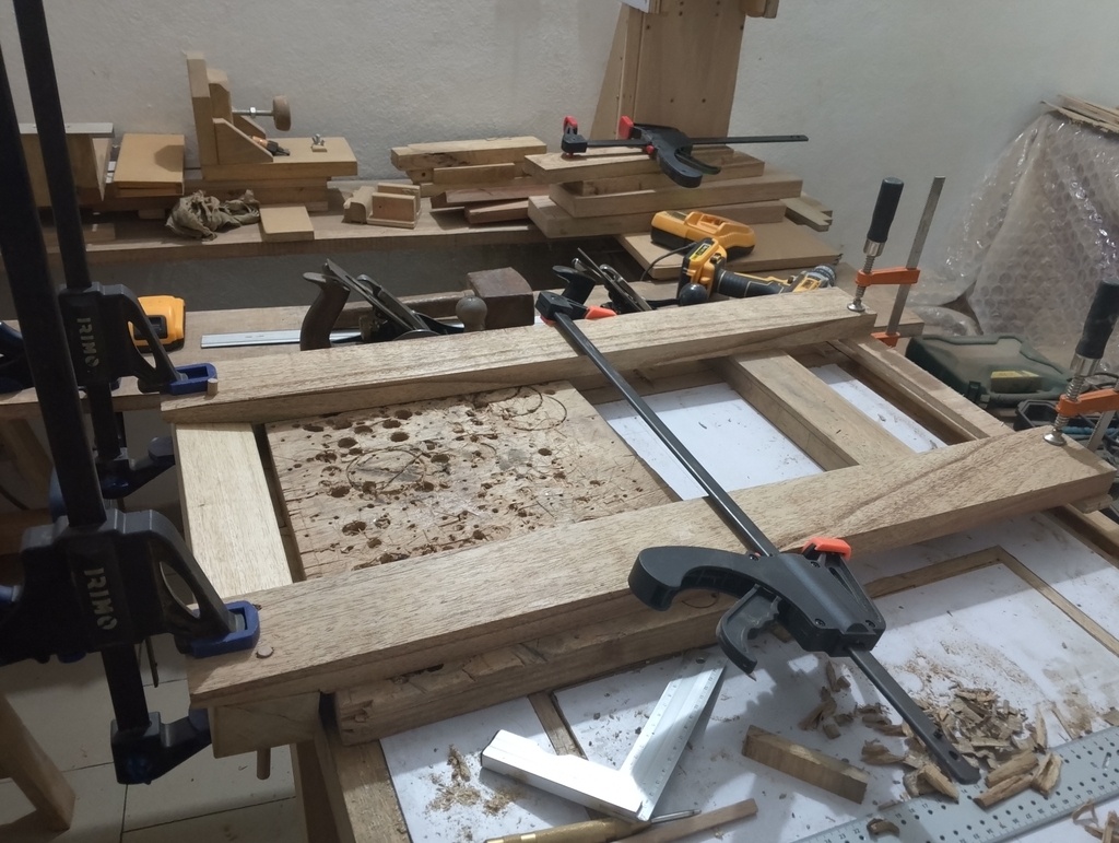 Ensuite assemblage, collage, serre-joints et on laisse se reposer jusqu'à demain (moi aussi, remarque). Par sécurité quelques trous laissent la place à deux tourillons par pied, à travers les traverses trapézoïdales (celles à queue d'aronde pour une fois sont assez bien réussies, ça ne bouge pas d'un poil). On laisse sécher la colle, et on s'y met, au plateau s'il vous plat.