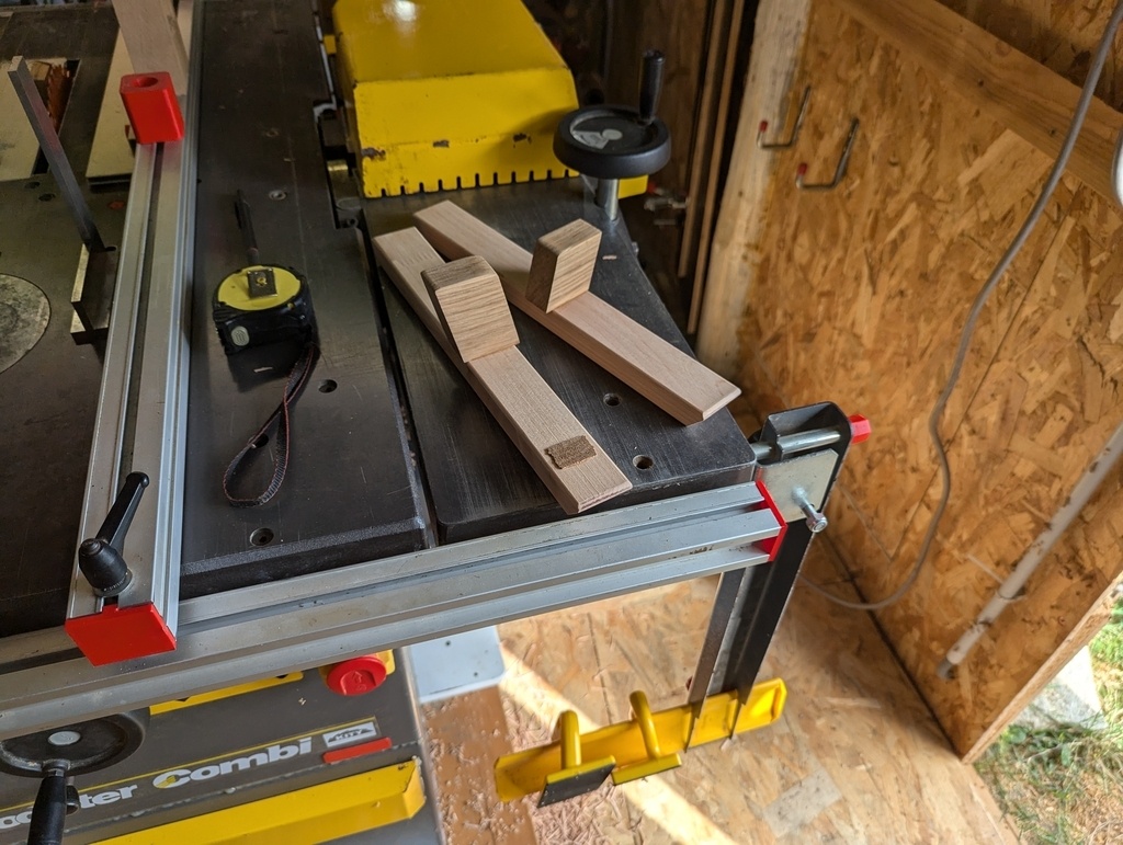 Le projet du chêne récalcitrant, celui que je ne savais pas trop comment utiliser (plein de nœuds, du bois tordu). À certains moments, le bois était tellement vrillé que j'aurais été chanceux d'obtenir plus d'un centimètre d'épaisseur sur une longueur utile de 2 mètres..