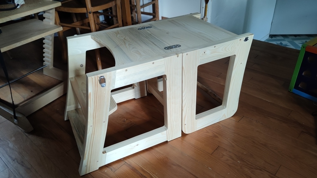 Cette tour lui permet de se mettre à hauteur pour atteindre une table, un plan de travail ou un lavabo debout et participer au activités comme la cuisine.