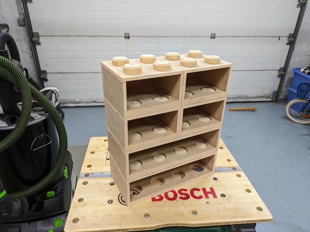 Un des mes fils est un grand amateur de ce célèbre jeu de construction (comme son papa à son âge d'ailleurs). Les pièces étaient rangées dans des boîtes de congélation pas très élégantes et je me suis dit que ce serait sympa de trouver des boîtes de rangement en forme de briques qu'il pourrait empiler. J'en ai trouvé mais c'était pas donné, surtout pour du plastique. J'en ai aussi trouvé en bois, mais là le prix était carrément prohibitif (dans les 120€ la petite boîte, en chêne d'accord, mais 120€ l'unité quand même...). Du coup je me suis dit que ce serait marrant de les faire moi même ! (spoiler alert : c'est pas si marrant que ça en fait