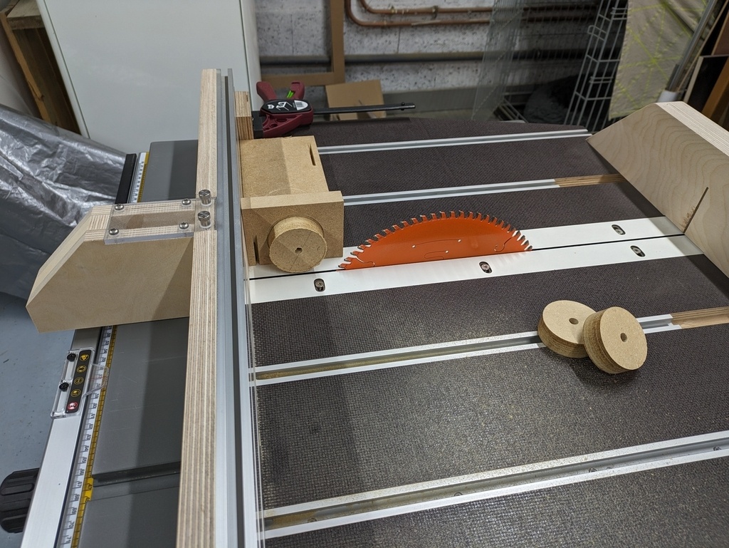 J'ai ensuite enlevé un peu d'épaisseur aux plots à la scie sur table avec un petit montage maison, puis je les ai chanfreinées à l'affleureuse.