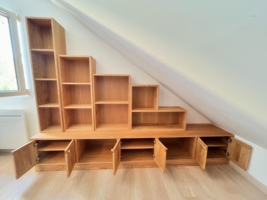 J’aime bien la progression que ça fait le long du rampant. Et les objets posés sur le dessus des caissons seront bien mis en valeur.