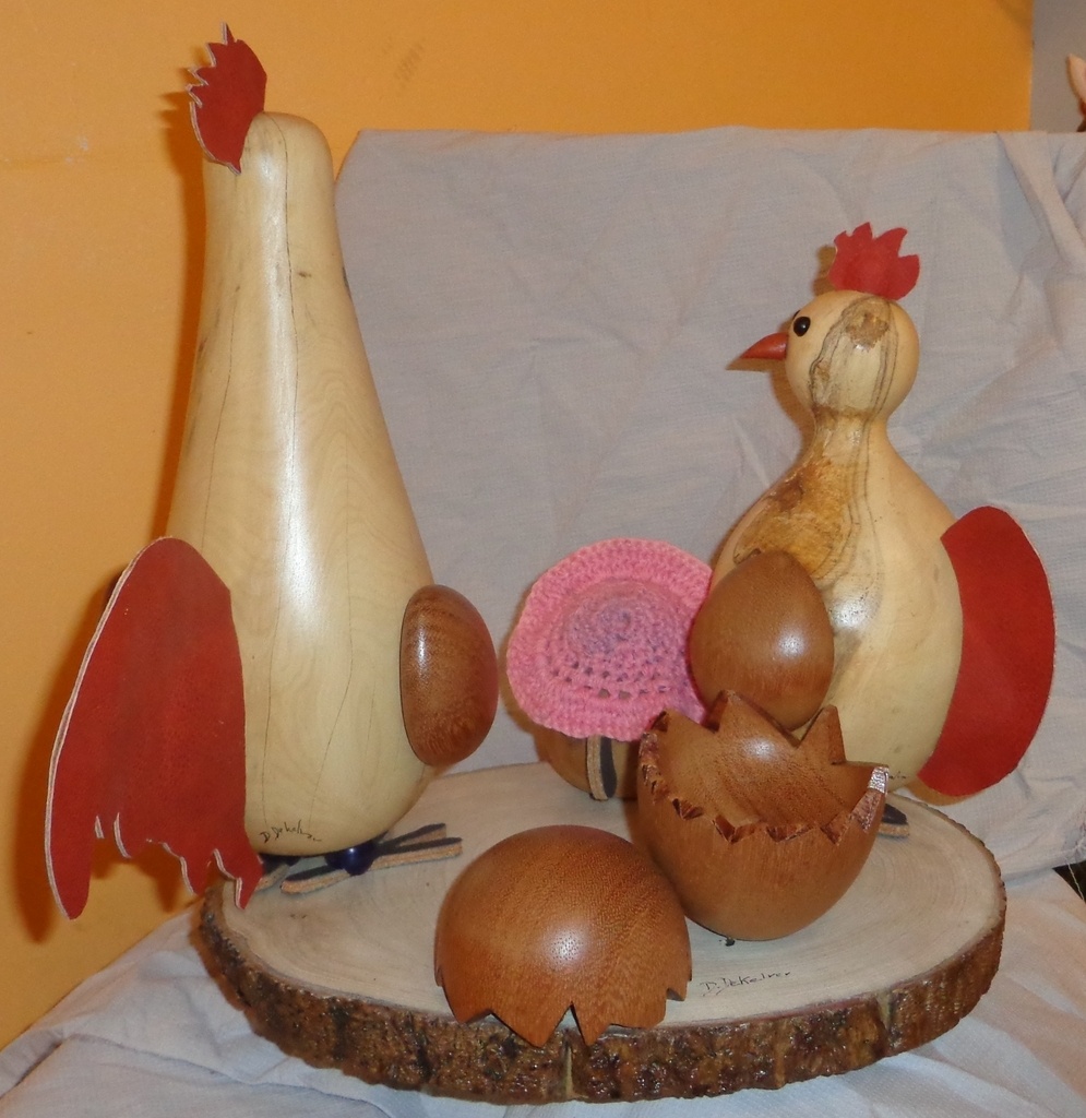 Madame poule, monsieur coq, le futur bébé (fille) et les restes de coquille (un peu sur dimensionnés, je l'avoue). Les corps des parents sont en buis, la crête et la queue sont découpés dans du simili de récup. Le poussin est en frêne.