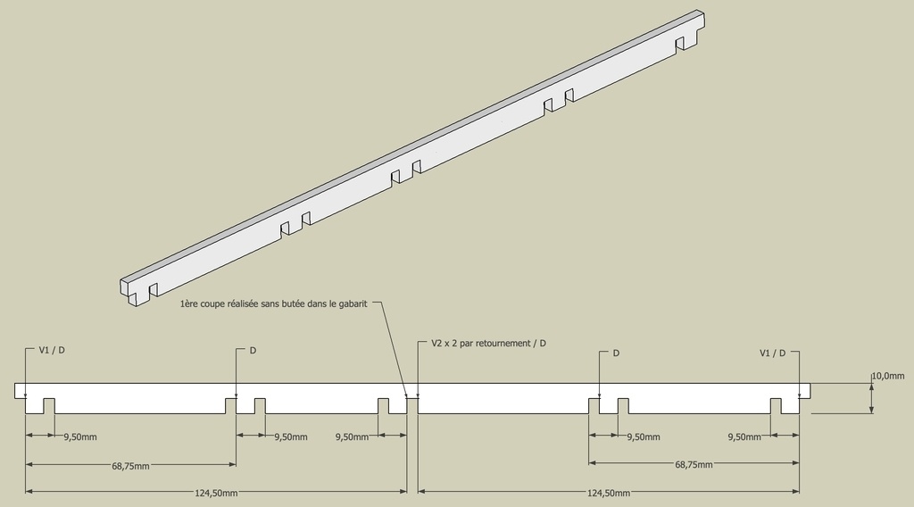 - la première encoche qui se situe au milieu de la pièce est réalisée avec la butée de mon gabarit de scie à format. Elle est étiquetée "V2 x 2 par retournement" et 2 cotes de 124,50mm en partent. Cela veut dire qu'en positionnant l'encoche sur la butée en V2 sur la plaque gabarit, l'usinage de l'encoche se trouvant au bout de la cote 124,50mm sera réalisée. Par retournement, on obtiendra en miroir l'autre encoche.