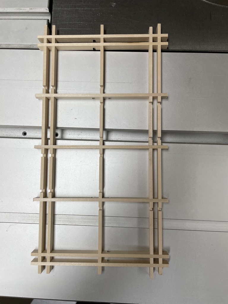 Ils ont été réalisés dans du peuplier (comme pour toutes mes réalisations de kumikos). Les baguettes ont une largeur de 10mm et une épaisseur de 3,5mm pour que les assemblages à mi bois puissent être faits également à l’aide d’un autre gabarit de scie à format dont la lame de débit a un avoyage de 3,5mm.