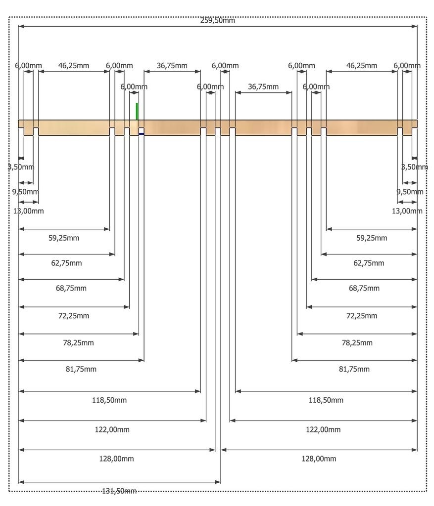 Pour réaliser toutes ces encoches, j'ai fabriqué ce gabarit avec des repères :
