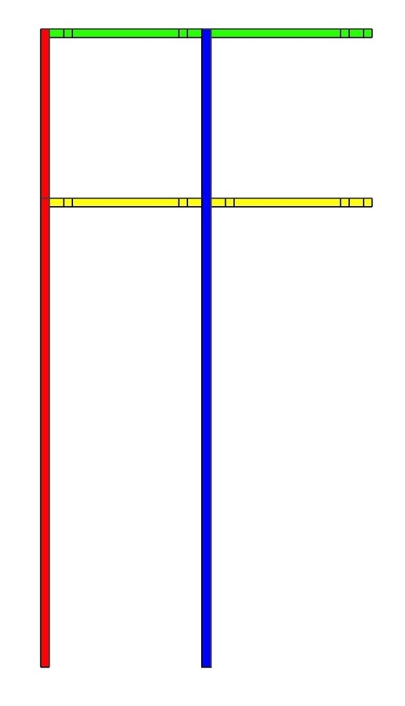 Et pour terminer la réalisation des pièces des panneaux, recoupe des traverses intermédiaires (Pièce jaune claire) à partir des traverses complètes intérieures (Pièce jaune)
