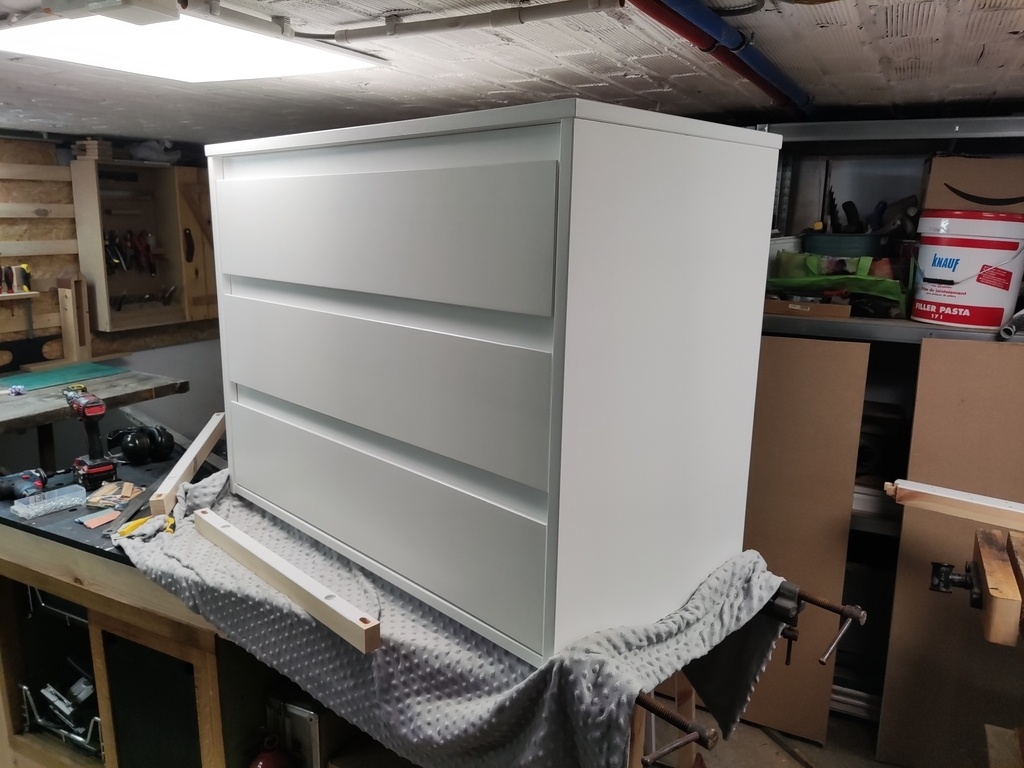 Commode 3 tiroirs, table à langer en MDF 22mm peint en blanc au rouleau laqueur.