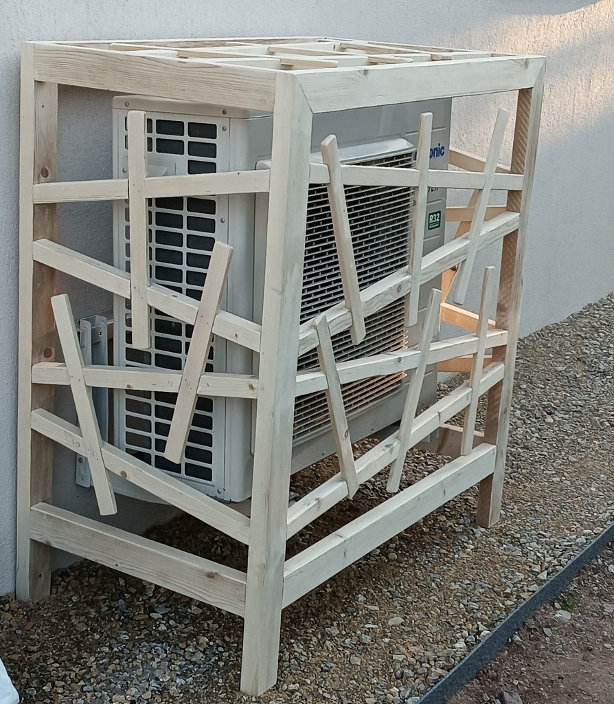 Pour me mettre en conformité avec l'urbanisme de ma ville, j'ai réalisé ce cache climatiseur avec des matériaux de récupération (charpente de la maison) sans faire de plan avec seulement les 3 côtes du bloc de climatisation.