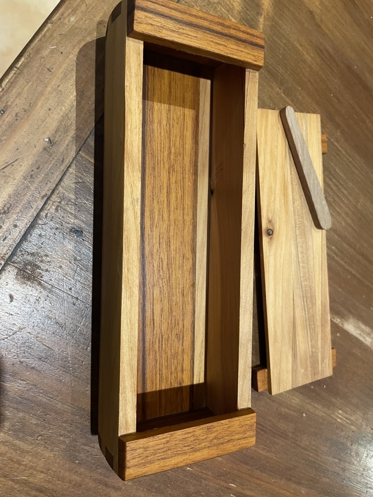 Un ami (il se reconnaîtra!) m’avait fait part de son projet de faire des boites à crayons japonaises. J’avais un morceau de bois qu’on m’avait donné et qui ne ressemblait à rien. Dans la série « pratique des queues d’aronde », j’ai donc décidé de me lancer dans un projet du style boîte à crayons, à ma façon.