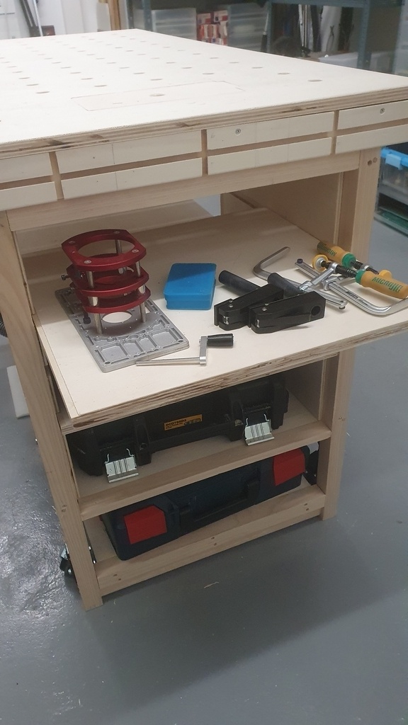Et je voulais une surface suffisamment grande, 140x70, des trous MFT, des rainures sur les côtés profilées en queue d'arronde pour pouvoir y mettre des serre joints queue d'arronde, la place de mettre mon aspirateur Bosch dessous, des étagères pour y mettre notamment ma visseuse et perceuse, et la possibilité de mettre ma petite défonceuse Makita sous table.