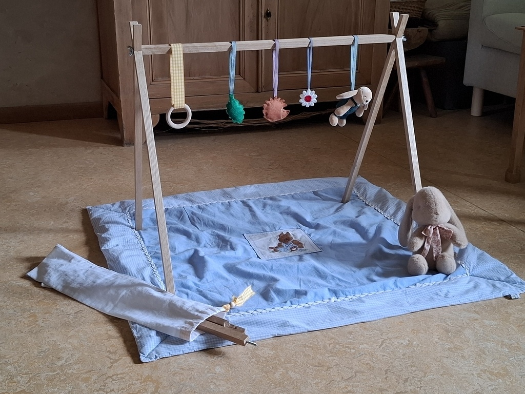 Pour la naissance de petits jumeaux, j'ai réalisé une arche d'éveil XXL. Tout est démontable afin de la ranger facilement sans prendre de place. Chaque élément fait 65 cm.