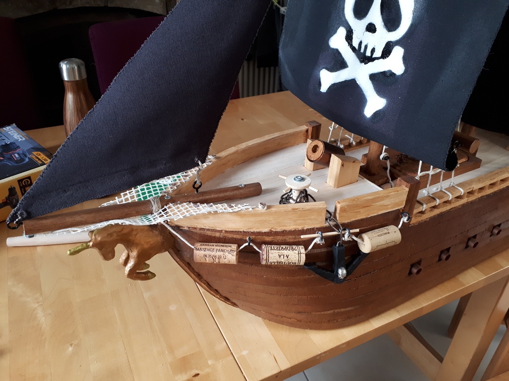 Les voiles sont prêtes, je bombe la principale avec un pochoir fais maison d'une tête de mort puis je pose le tout sur les mâts. Je fais aussi appelle au talents en macramé de ma copine pour poser les filets sur les mâts et le tour est joué ! Pas sûr qu'il flotte mais il y a de quoi partir à l'abordage !