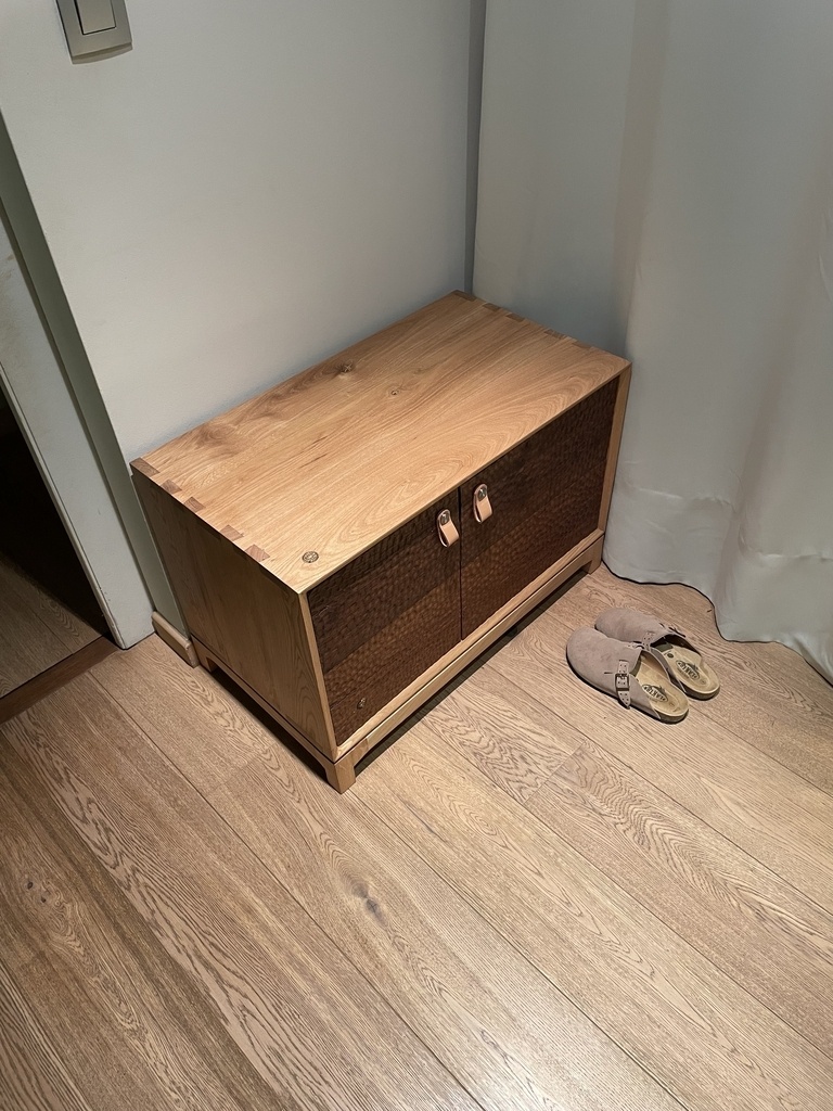 Banc à chaussures pour entrée en chêne (clair et foncé et de recup) et porte chapeau patère avec les mêmes essences, je voulais lui donner un style “japonisant”