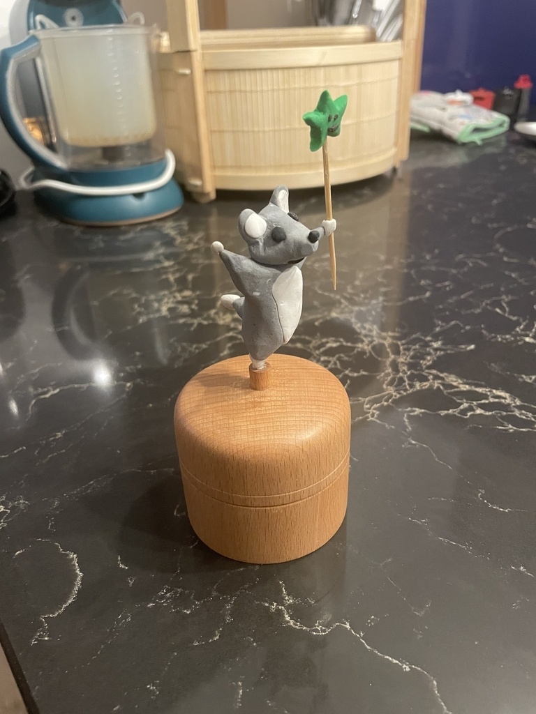 C est un joli objet d art populaire ,quel dommage que la souris ne soit pas monoxyle avec le couvercle , le sculpteur qui a été capable de la modeler en pâte fimo doit être en mesure de la tailler dans le bois c est ma conviction .