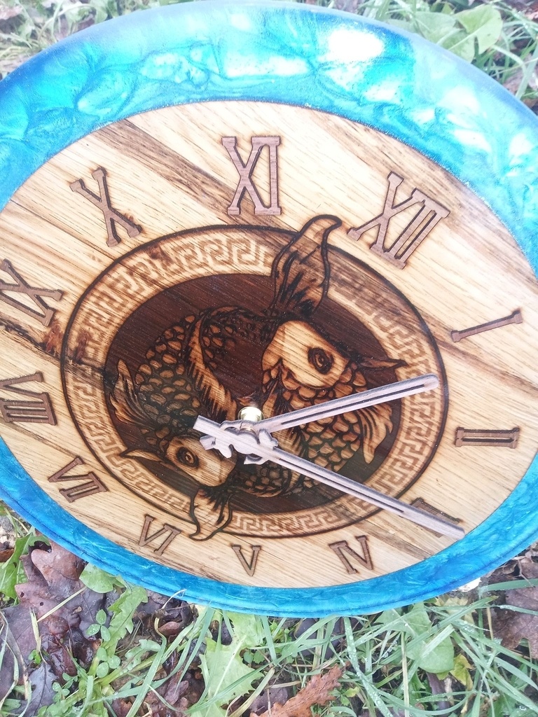cette horloge de Ø 35cmen châtaigniergravure et découpeajout des chiffre en noyerréalisation des insert en noyerepoxy bleu et transparent