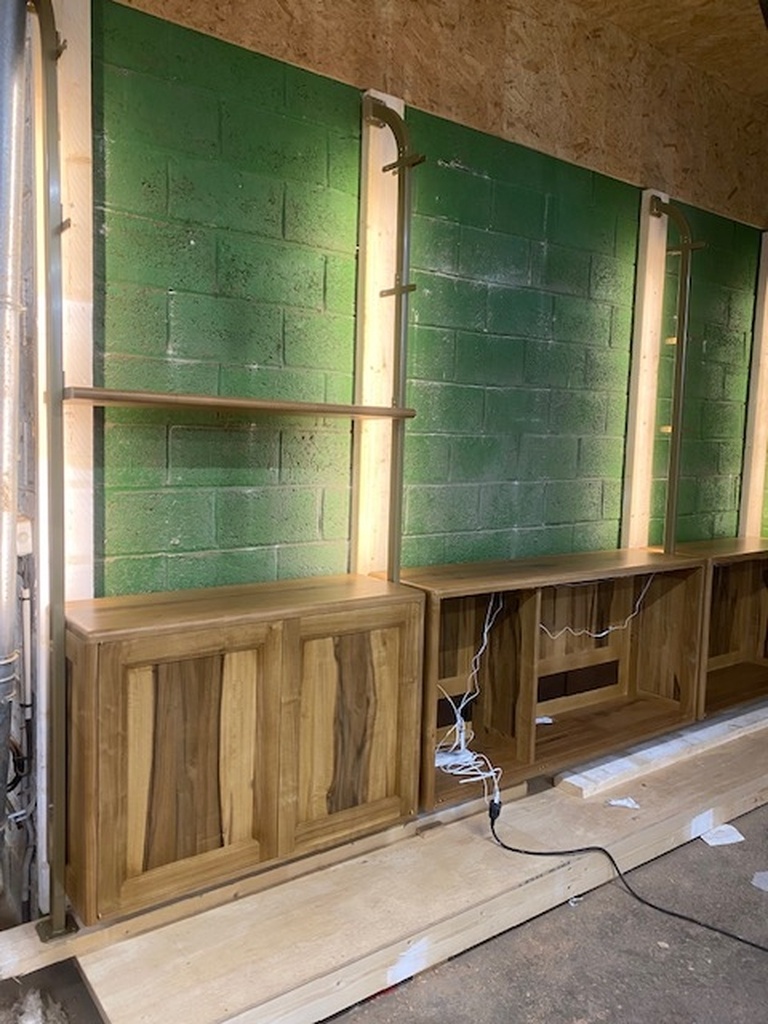 Partant du désir de ma cliente, ayant trouvé l'inspiration chez Diotti ,Roche Jolibois et consort , souhaitant une structure en métal légère, une signature lumineuse, du bois massif, de jolies quincailleries en laiton, des ouvertures push to open.....