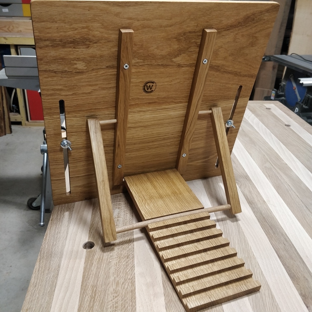 Extra! Mon fils m’a commandé un lutrin pour tenir ses partitions de musique (oui c’est comme ça qu’ils disent au Québec ) et je suis arrivé au même mécanisme quand j’ai préparé les plans... Tu as pris quelle épaisseur pour les baguettes à l’arrière et quel diamètre pour les tourillons ?