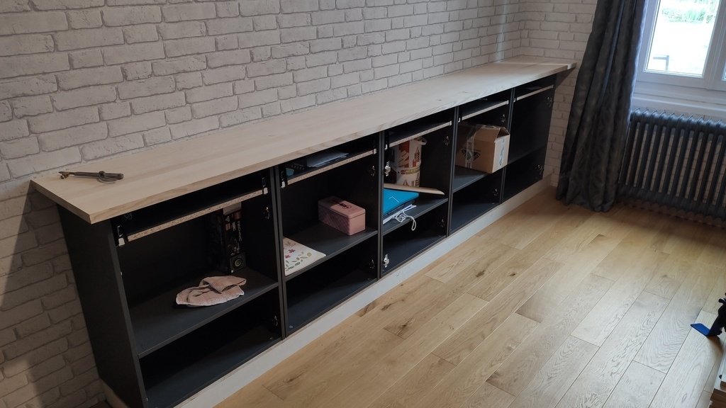 Petit conseil si je puis me permettre : une fois bien remplie, le poids de la partie haute risque de faire ployer les montants des caissons bas de GSB. Aussi, s’ils n’ont pas un fond assez épais, et comme tu as laissé un écart entre deux caissons, les montants pourraient flamber.