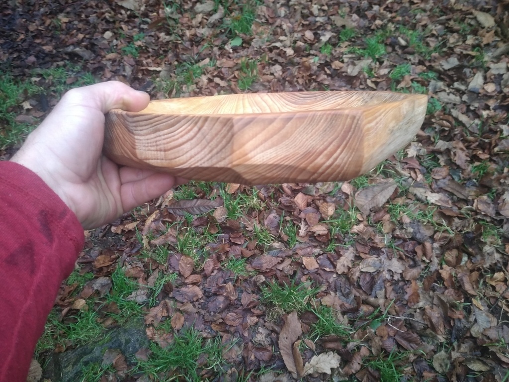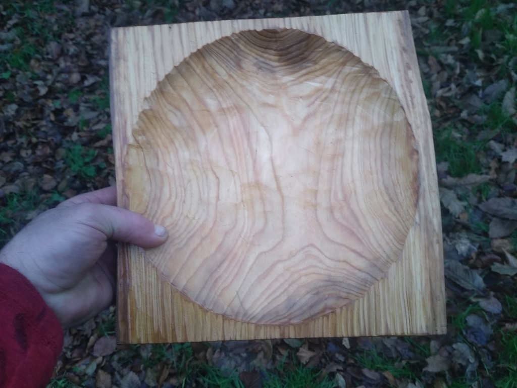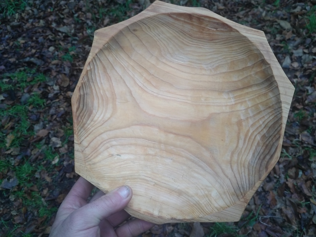 Dégrossi de l'assiette à l'herminette puis avec les gouges.