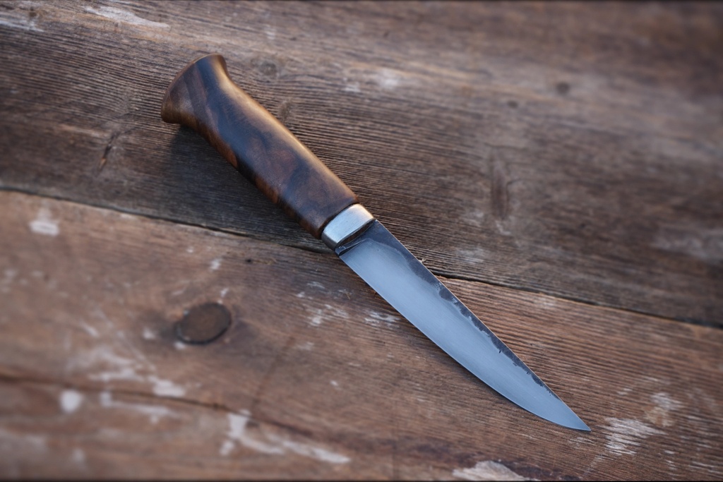 Je vous présente ce puukko style début XXe. Son manche est sculpté dans de la loupe de noyer, il révèle des veines tourmentées, des motifs profonds et une texture unique.