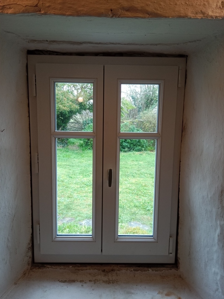 Portes en chêne bicolores avec ouvrants oscillo battant et fenetres. Copie des proportions de petits bois de l existant et panneaux bas extérieurs rainurés.