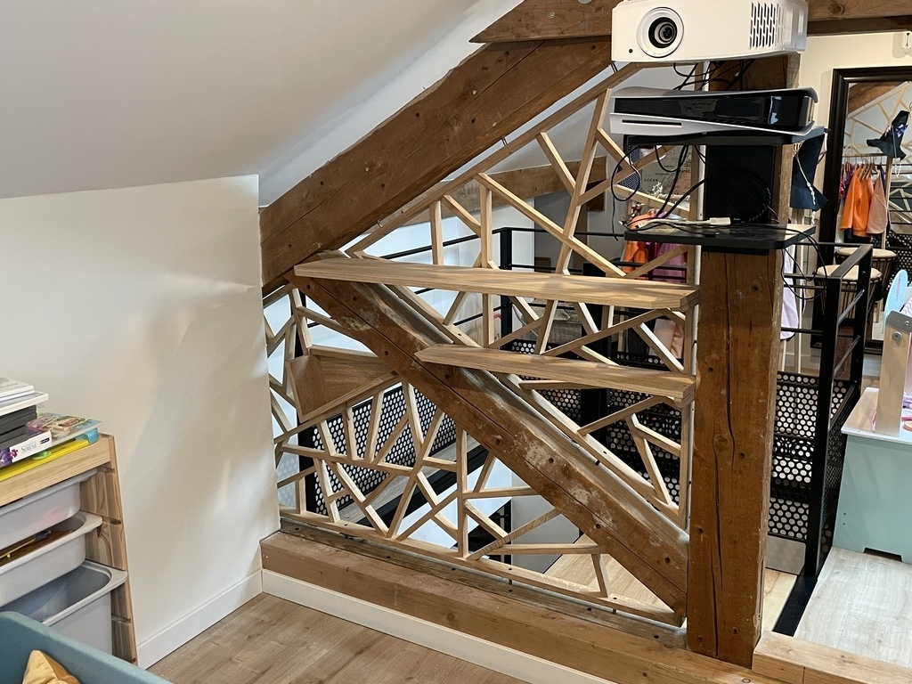 J’ai proposé d’installer un garde corps entre les poutres et d’y intégrer un «tiroir» et des étagères