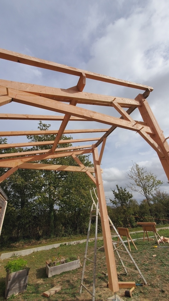 Je vous présente un chantier-école encadré au cours du module charpente de la formation TEC (technicien en éco-construction, formation équivalente à OPEC) délivrée par la MFR du Val d'Erdre à Riaillé, en Loire-Atlantique.