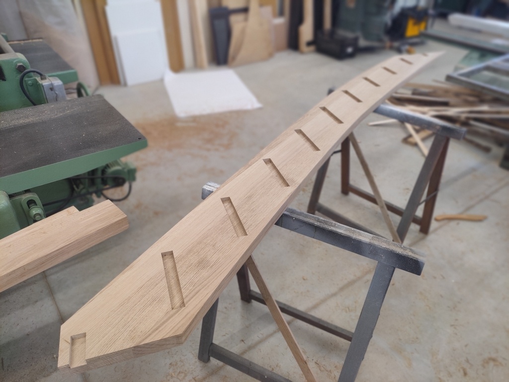 Découpe des limons avec la scie à ruban suivant la rainure puis fraise à copier.