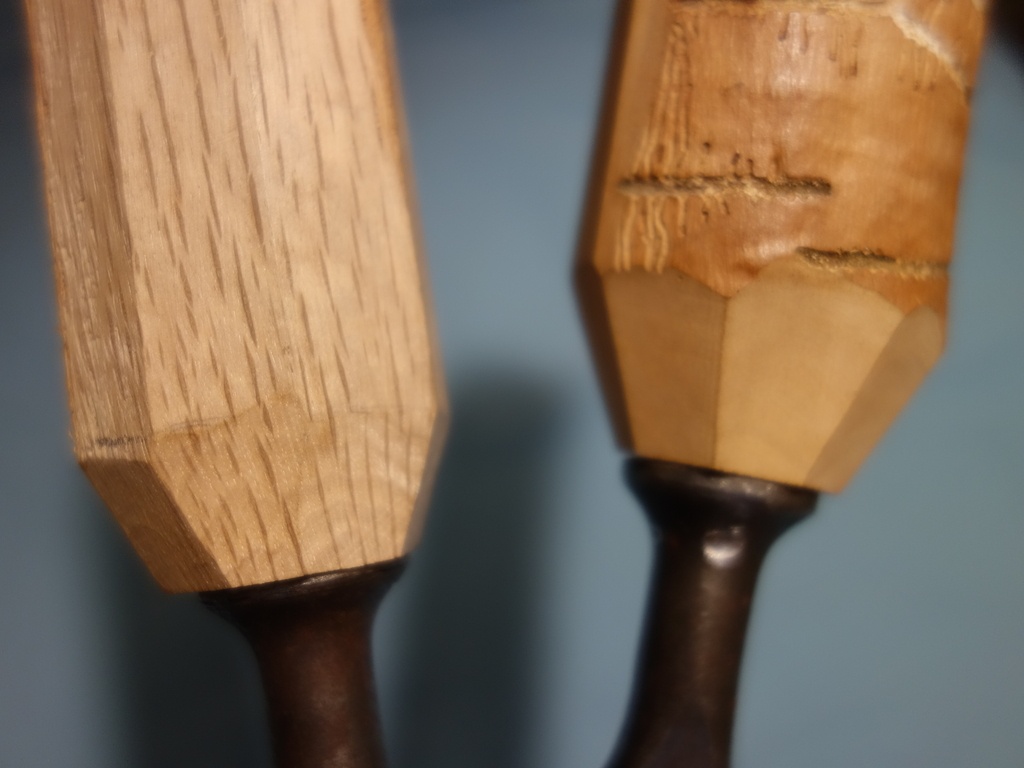 Second manche fait dans une branche de chêne vert. Pour le coup, ça m'a l'air bien plus adapté, le bois est dur, dense, et difficile à fendre.
