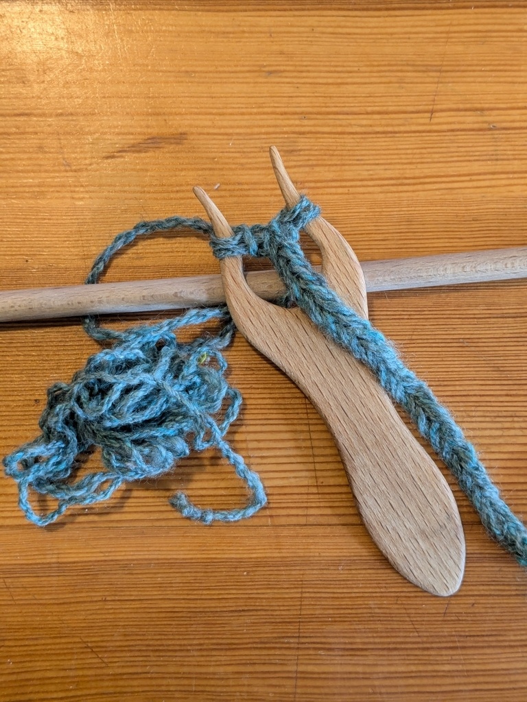 Un lucet ou lucette, outil de tressage de cordelettes, façonné dans une spatule à raclette.