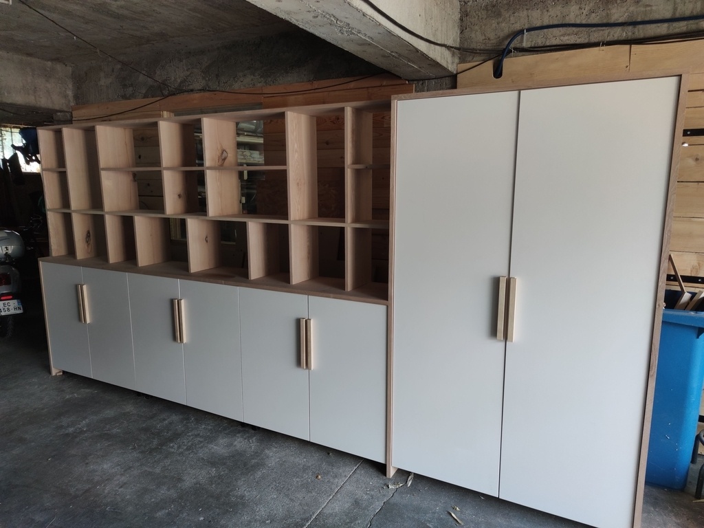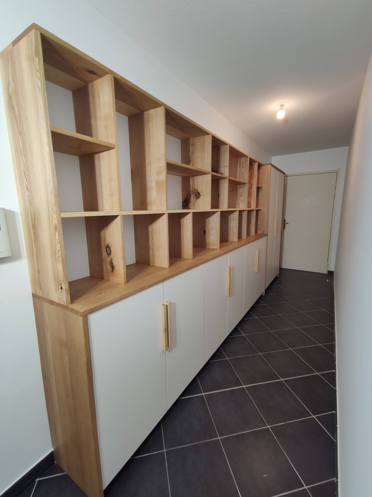 Fabrication d'un meuble d'entrée en frêne massif et portes en mélaminé. Poignées cornières en frêne.