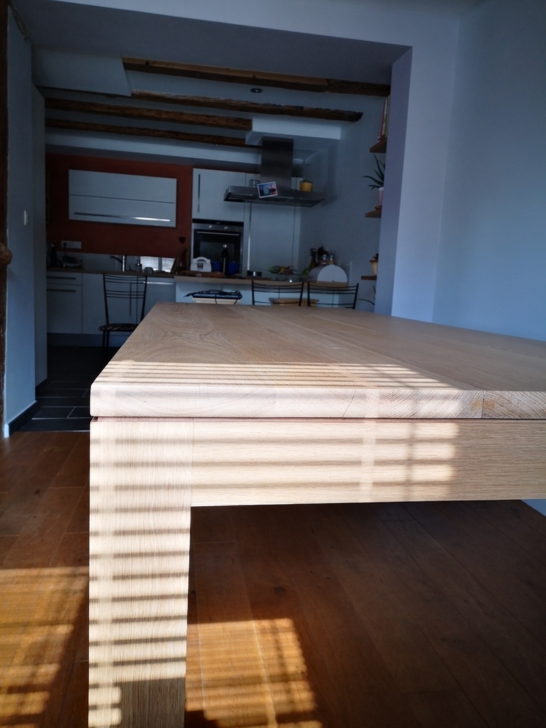 Bonjour, voici ma dernière fabrication. Il s'agit d'une table de salle à manger en chêne massif de 2200mmx900mm.