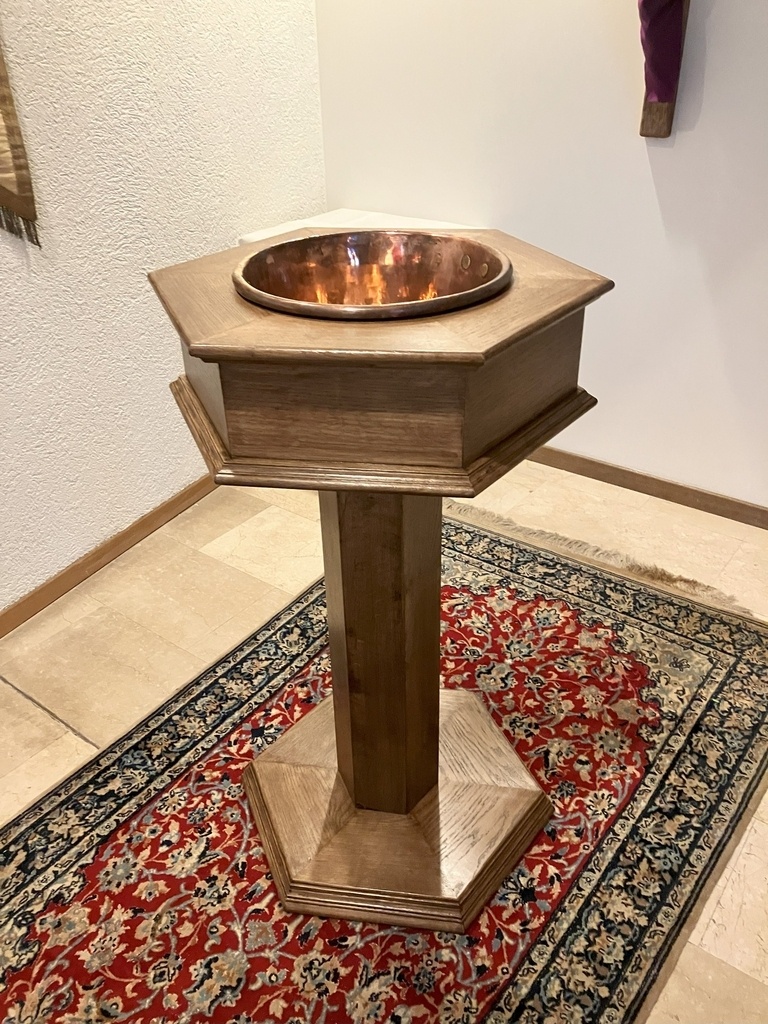 Baptistère en chêne vernis satin foncé.