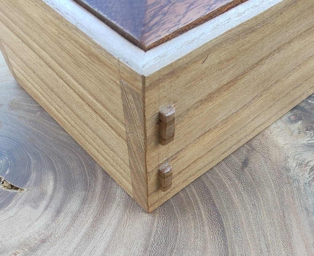 Boîte en orme, exotique et chêne avec assemblages d'angles à tenons mortaises à coins, avec onglets. Le fond est inséré dans une rainure.