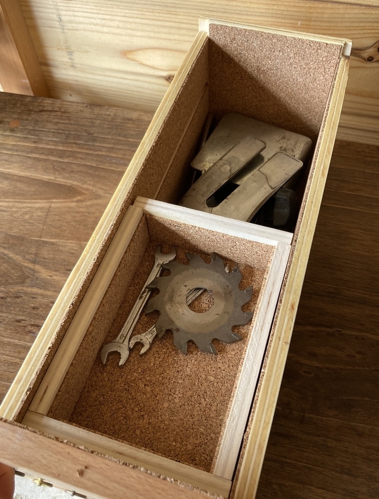 J'ai un peu amélioré l'intérieur des tiroirs en collant du liège (2mm d'épaisseur à l'intérieur). J'ai fait aussi quelques aménagements pour utiliser l'espace au mieux.