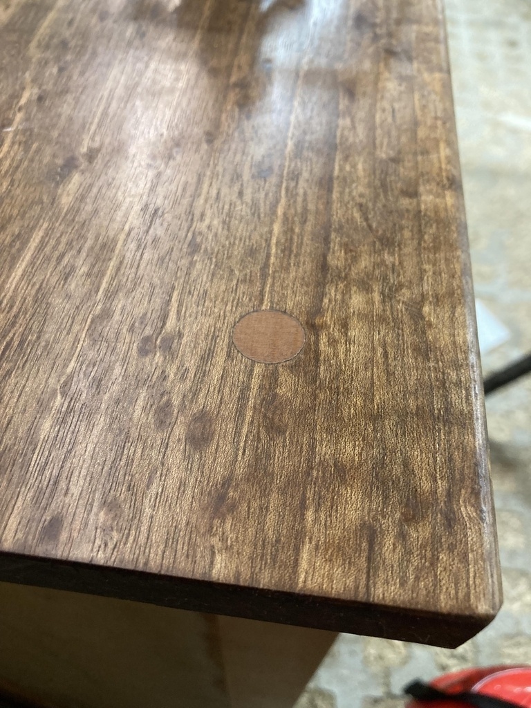 La finition est à l'huile de tung, j'ai poncé jusqu'au grain 320 et appliqué plusieurs couches. Je voulais essayer d'obtenir une finition satinée. Le résultat était très bon, mais la surface redevenait irrégulière au bout de quelques jours. J'ai compris ensuite que c'était dû au relevage des fibres du bois et qu'il aurait fallu humidifier d'abord la surface avec de l'eau puis laisser sécher. Finalement, au moins pour le plateau, j'ai réussi à obtenir à peu près ce que je voulais en ponçant à nouveau plusieurs fois et en remettant des couches d'huile.