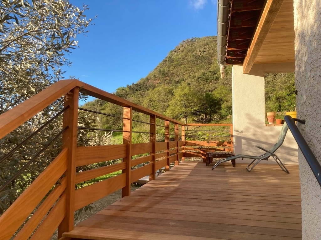 le plancher est en cumaru sur lambourde en pose flottante, le garde-corps est en sipo et en fer