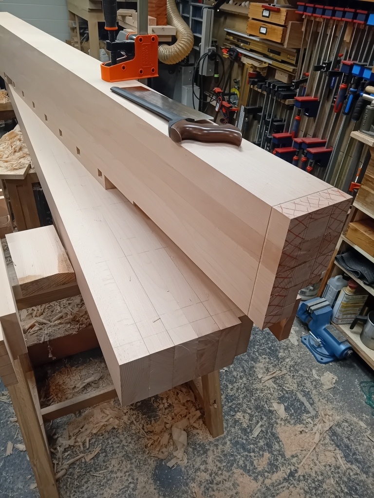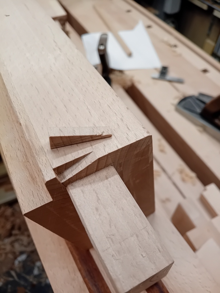 Pour l'assemblage j'ai choisi des tenons avec des… coins? je ne connais pas le nom mais une photo vaut mille mots.