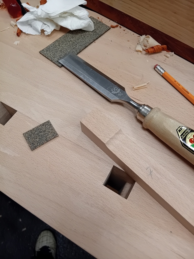 Je taille le tenon qui va accueillir la pièce pour la presse latérale aux outils à mains.